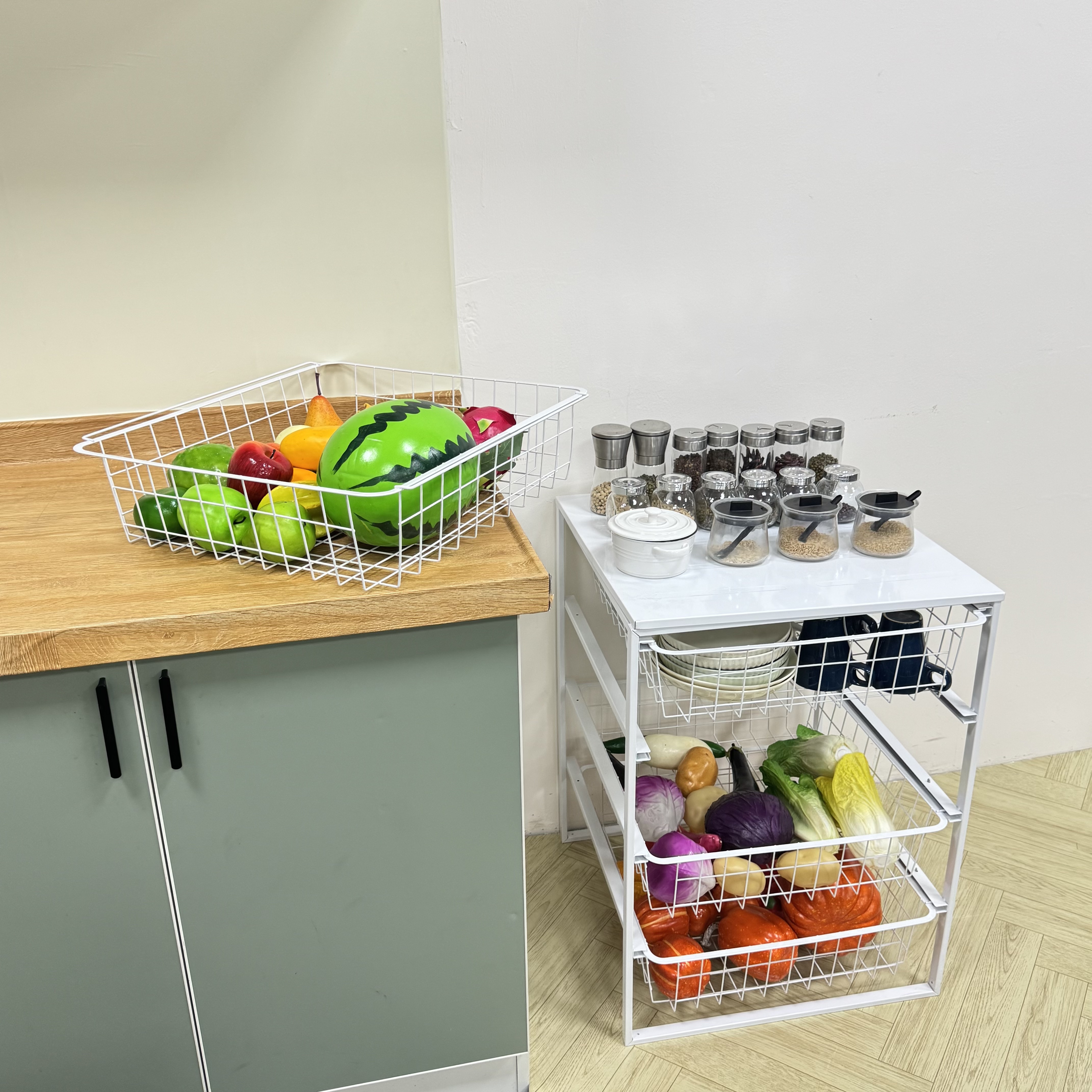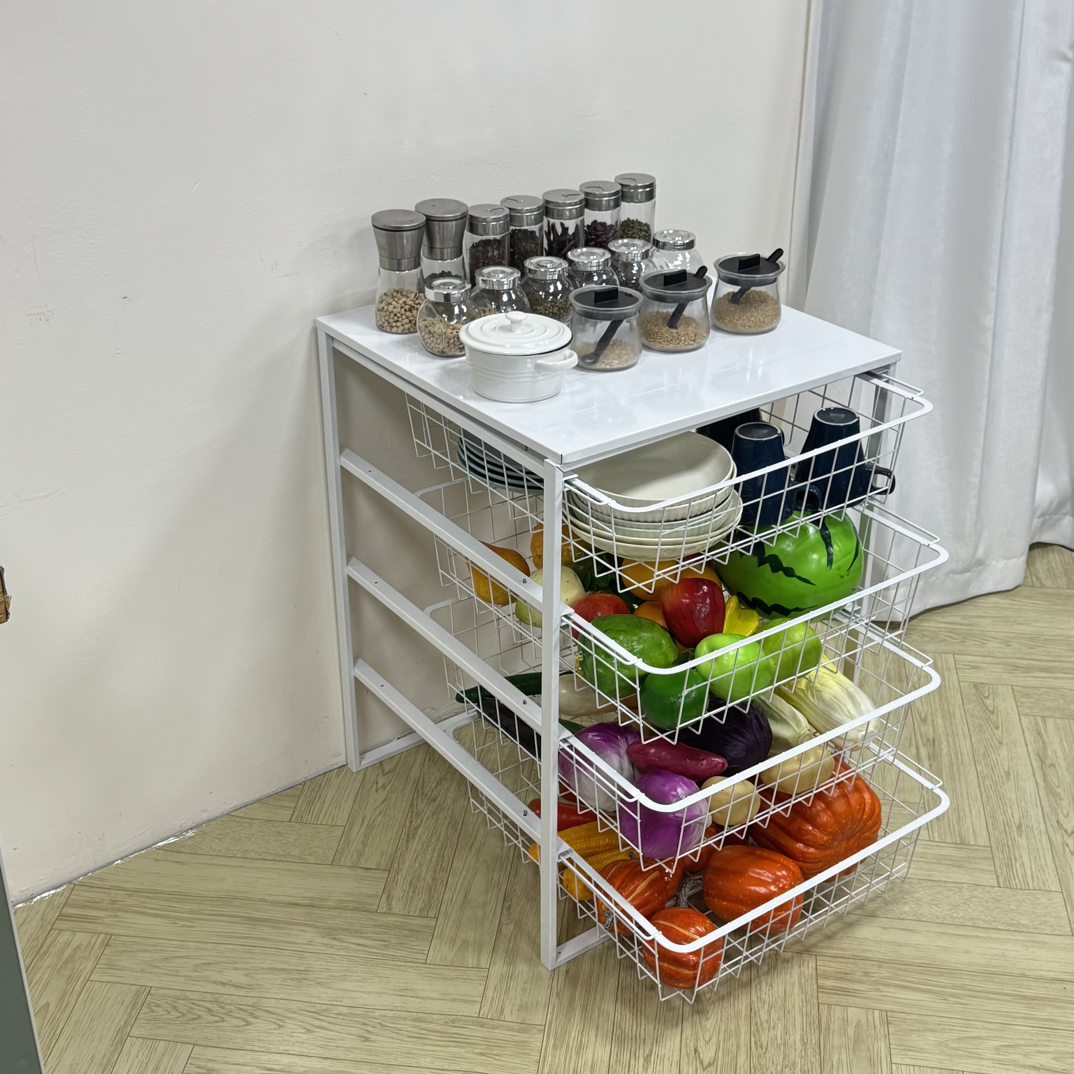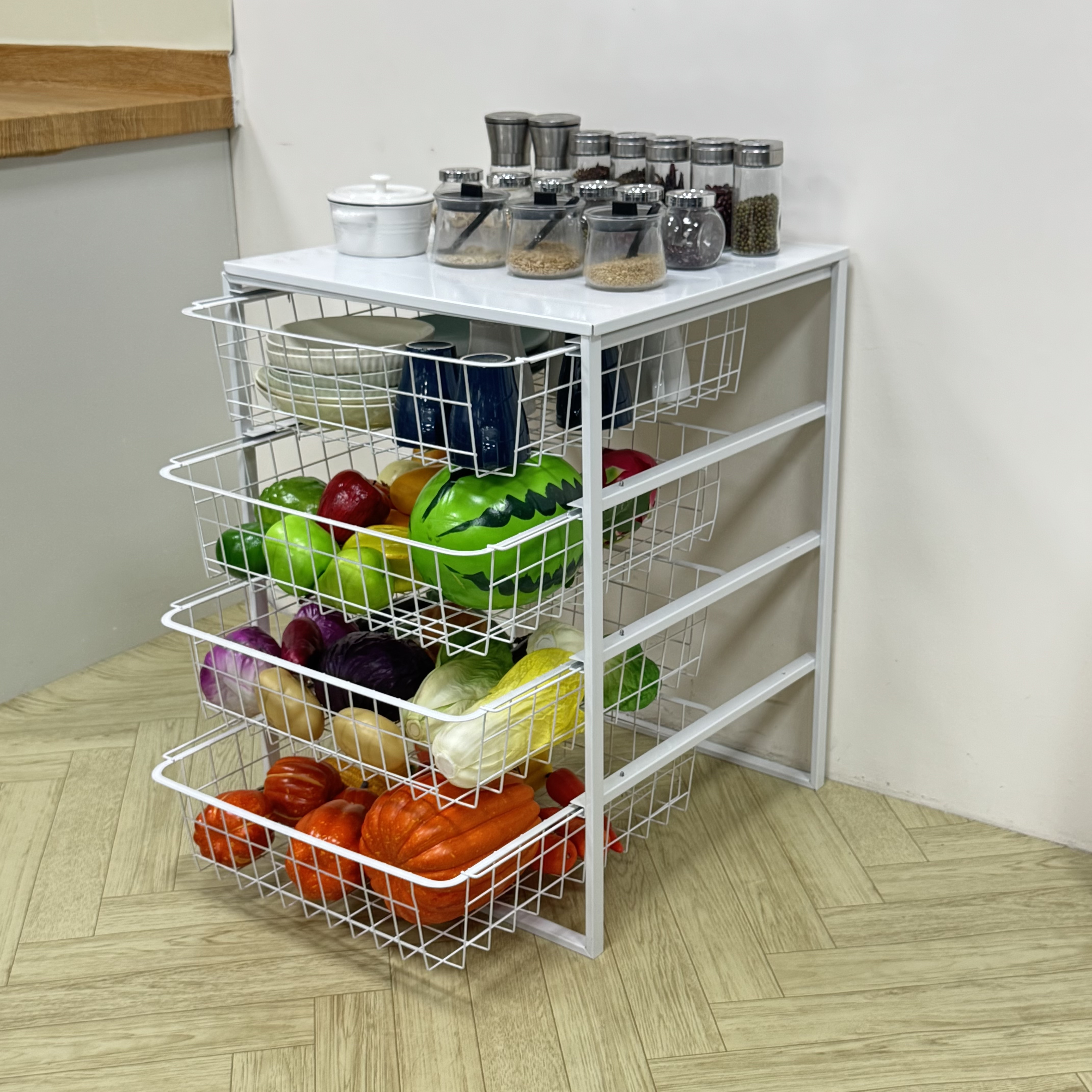 Space-Efficient Design: Features 4 deep, breathable metal wire baskets that slide out smoothly, providing easy access to all items.
