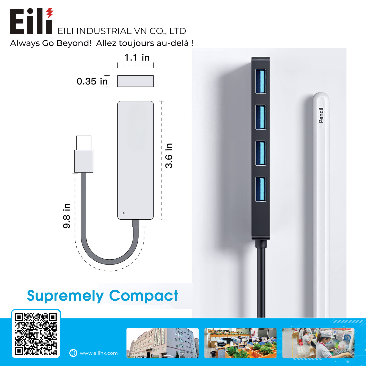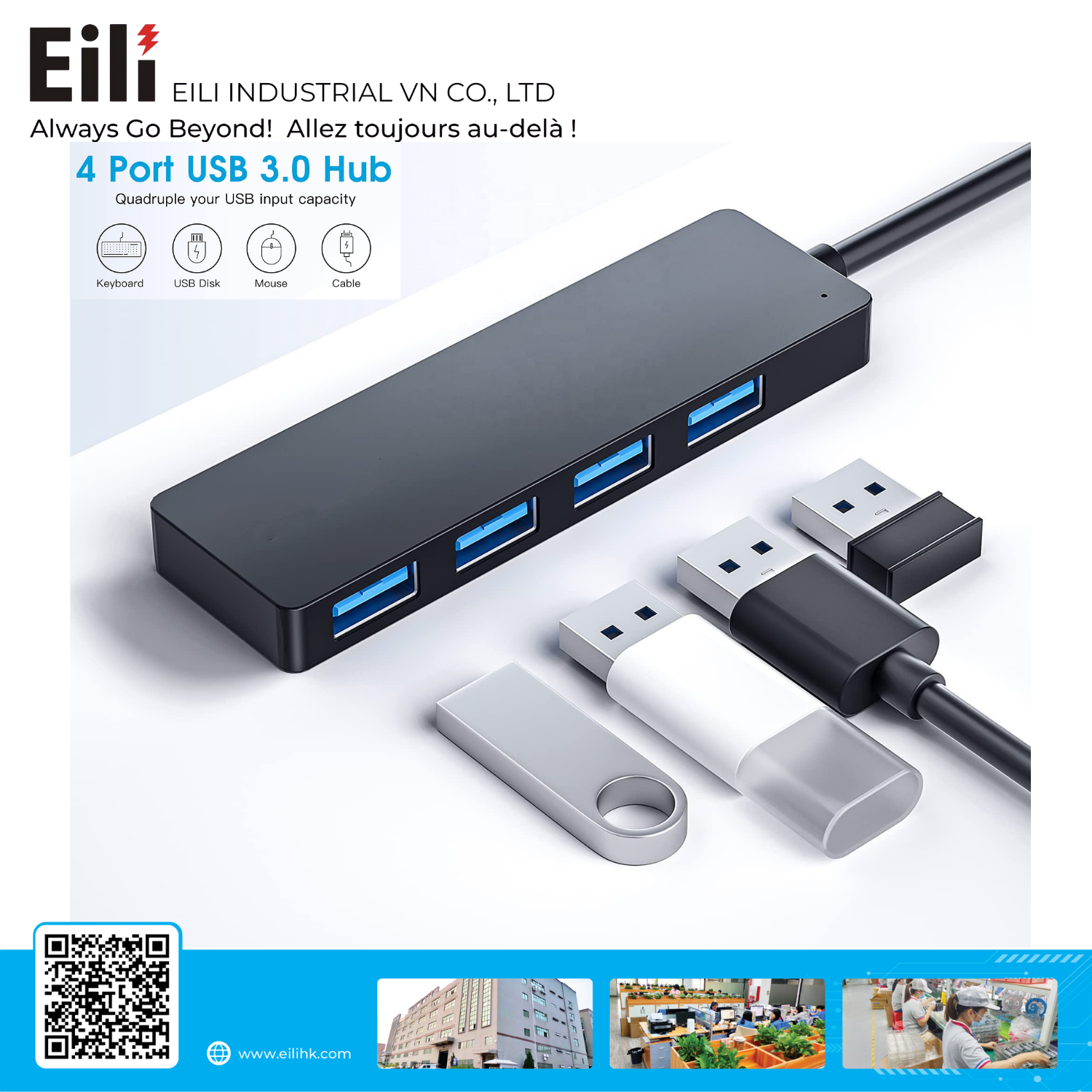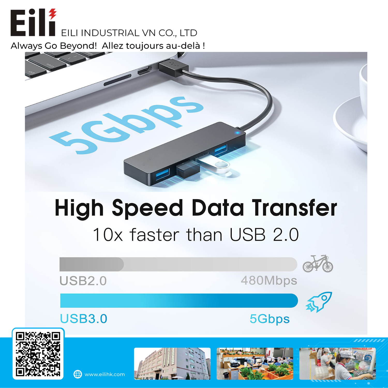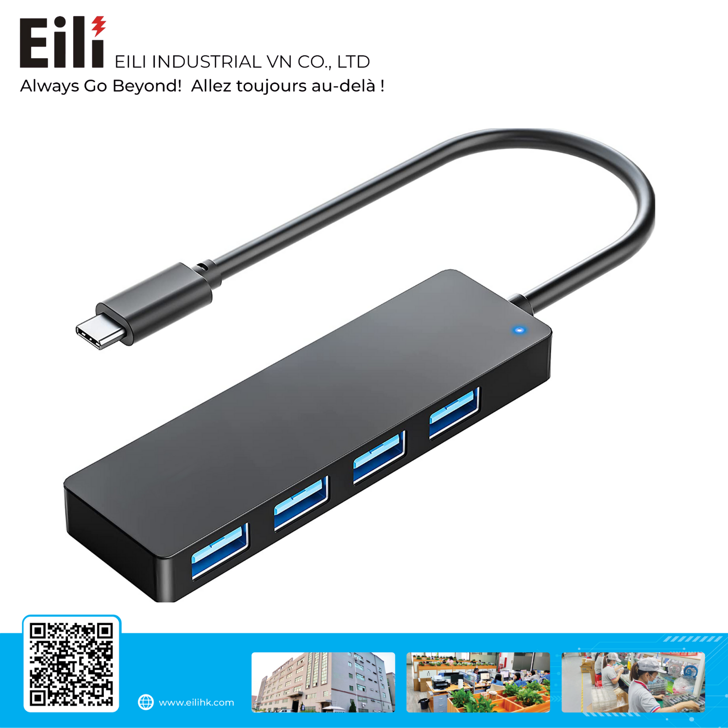 4-port USB 3.0 Hub (4-in-1 Type-C Hub) expands one USB-C port into four USB-A 3.0 ports, delivering transfer speeds up to 5Gbps. Designed with an ultra-thin plastic housing, it is lightweight and convenient for daily use, perfect for laptops, tablets, and other USB-C devices.