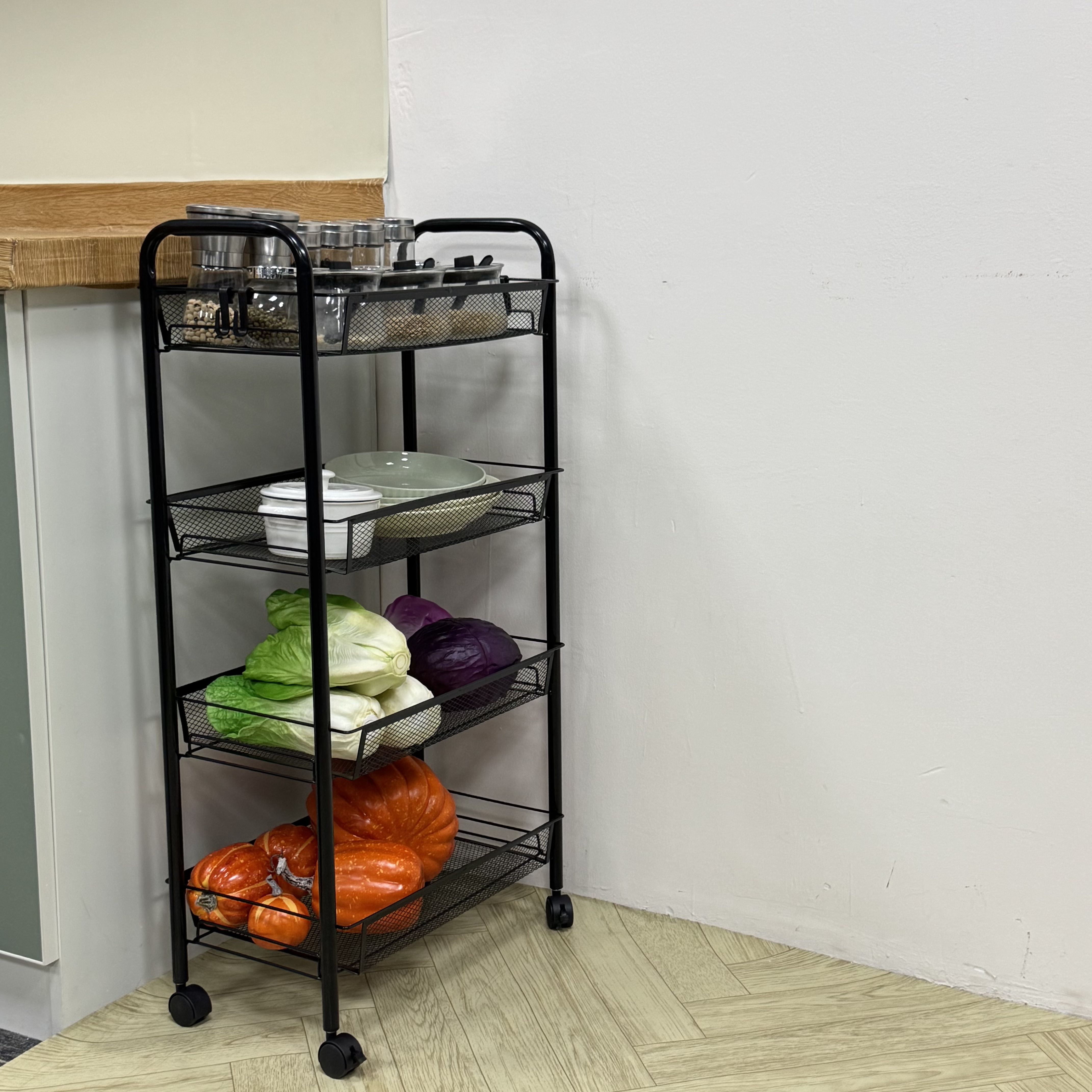 Smooth & Stable Mobility: Four heavy-duty casters allow 360-degree rotation. Two wheels lock securely to keep the cart in place when needed.