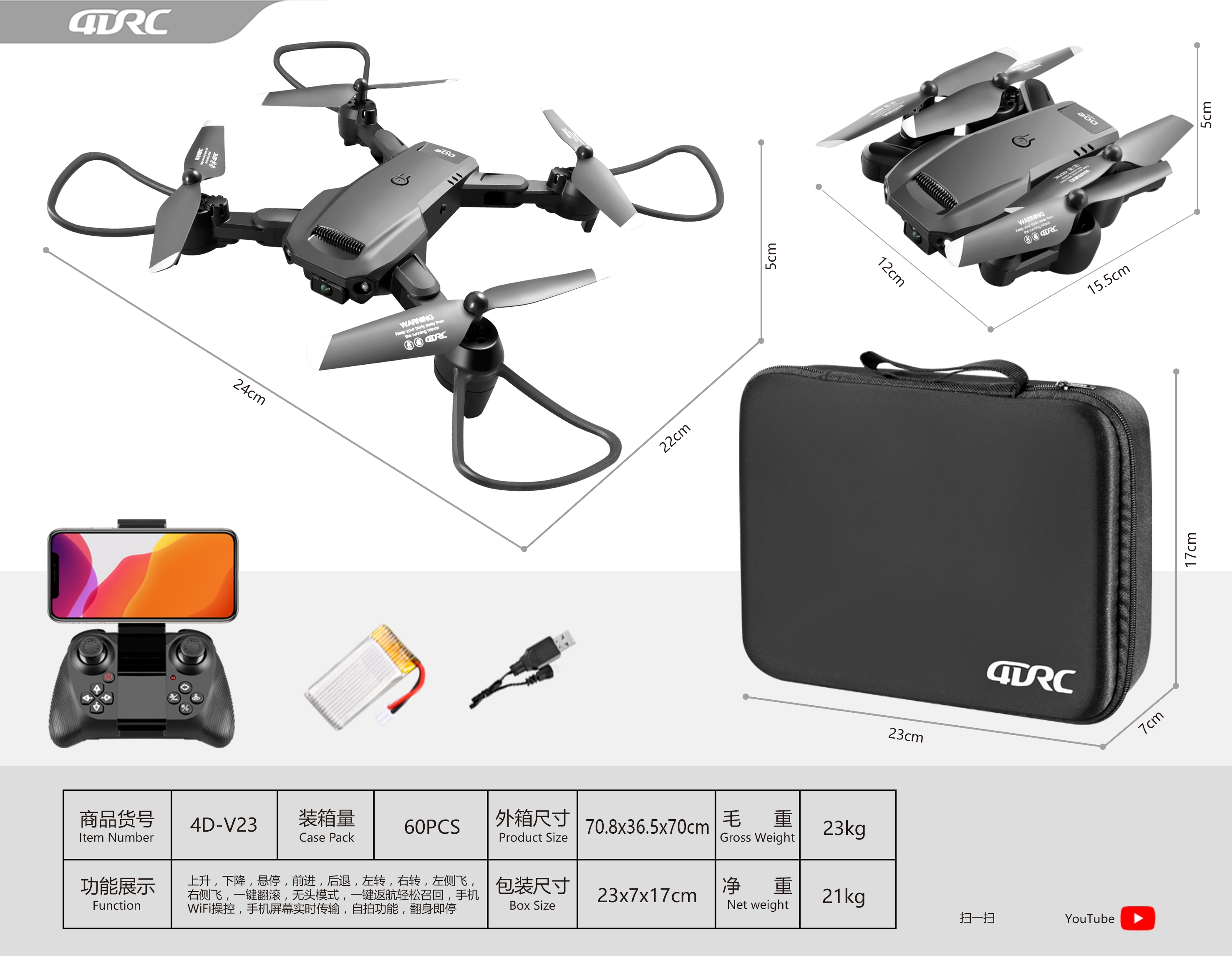 Function: One key take-off/landing, Forward/backward, Turn left/right, Left/right side-flying, Ascent/descent, Altitude hold, Auto hover/flip, Headless mode, Roll over to stop. (Only Available for Camera Option, WiFi camera with selfie, APP FPV real time transmission)