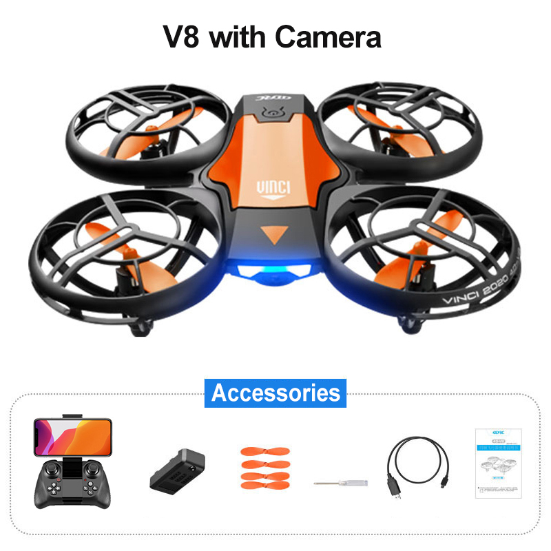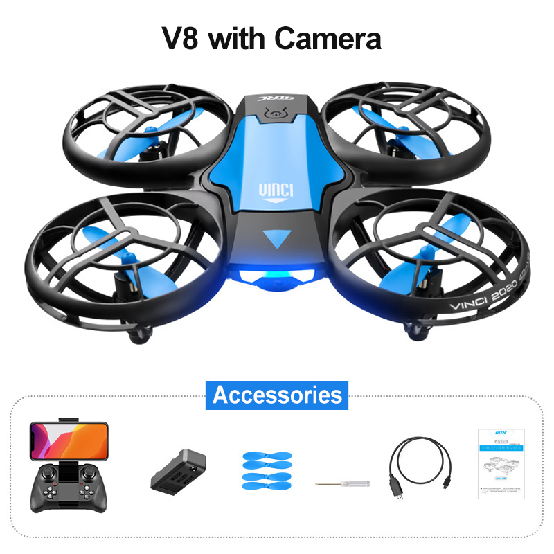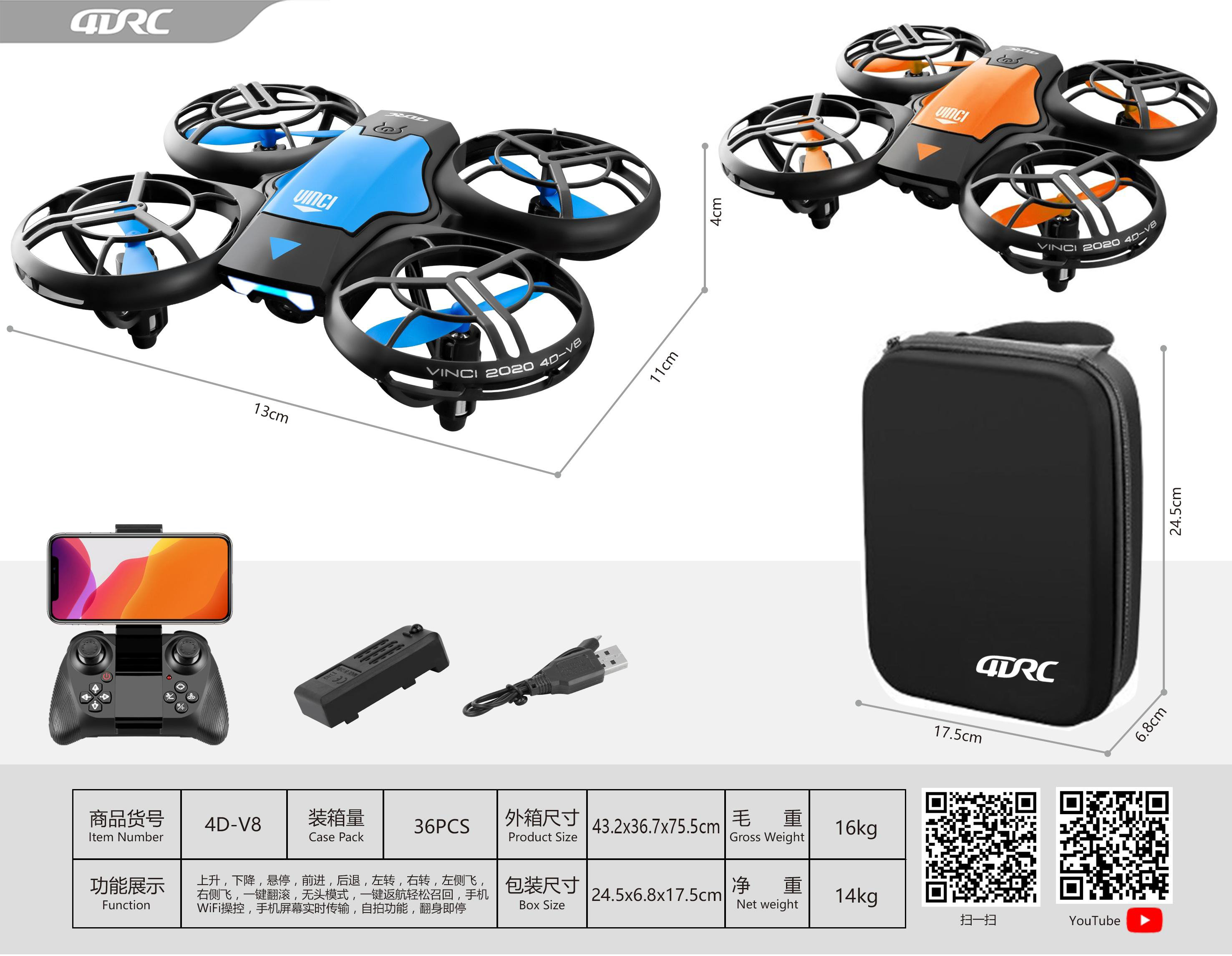 Function: One key take-off/landing, Forward/backward, Turn left/right, Left/right side-flying, Ascent/descent, Altitude hold, Auto hover/flip, Headless mode, Roll over to stop. (Only Available for Camera Option, WiFi camera with selfie, APP FPV real time transmission)