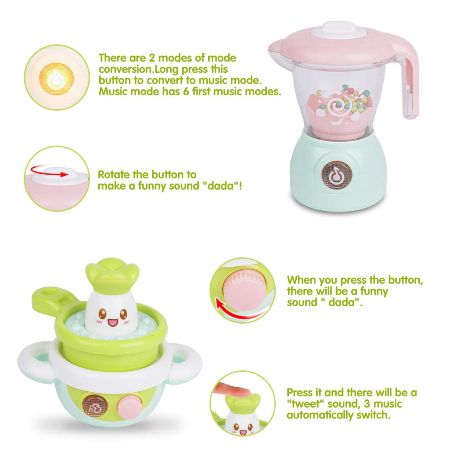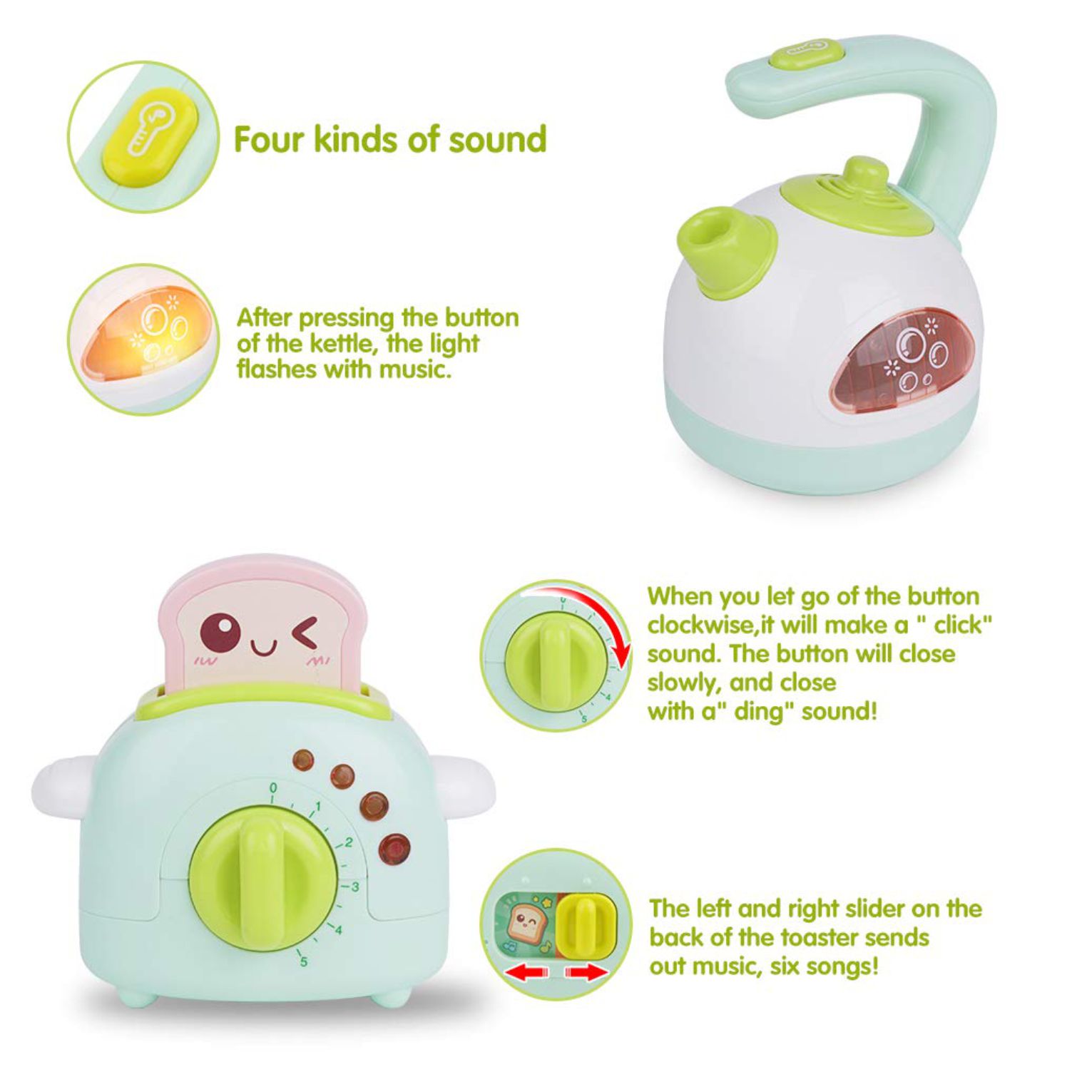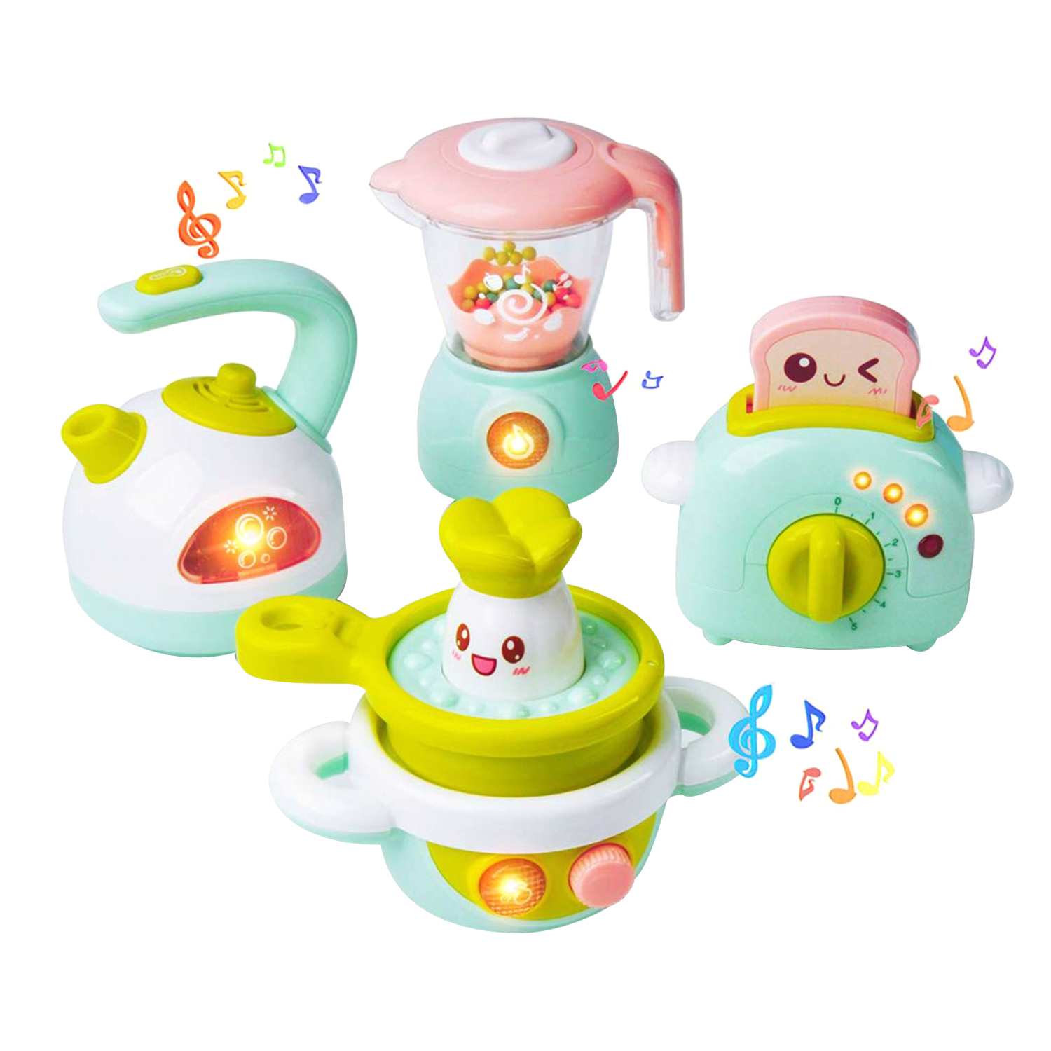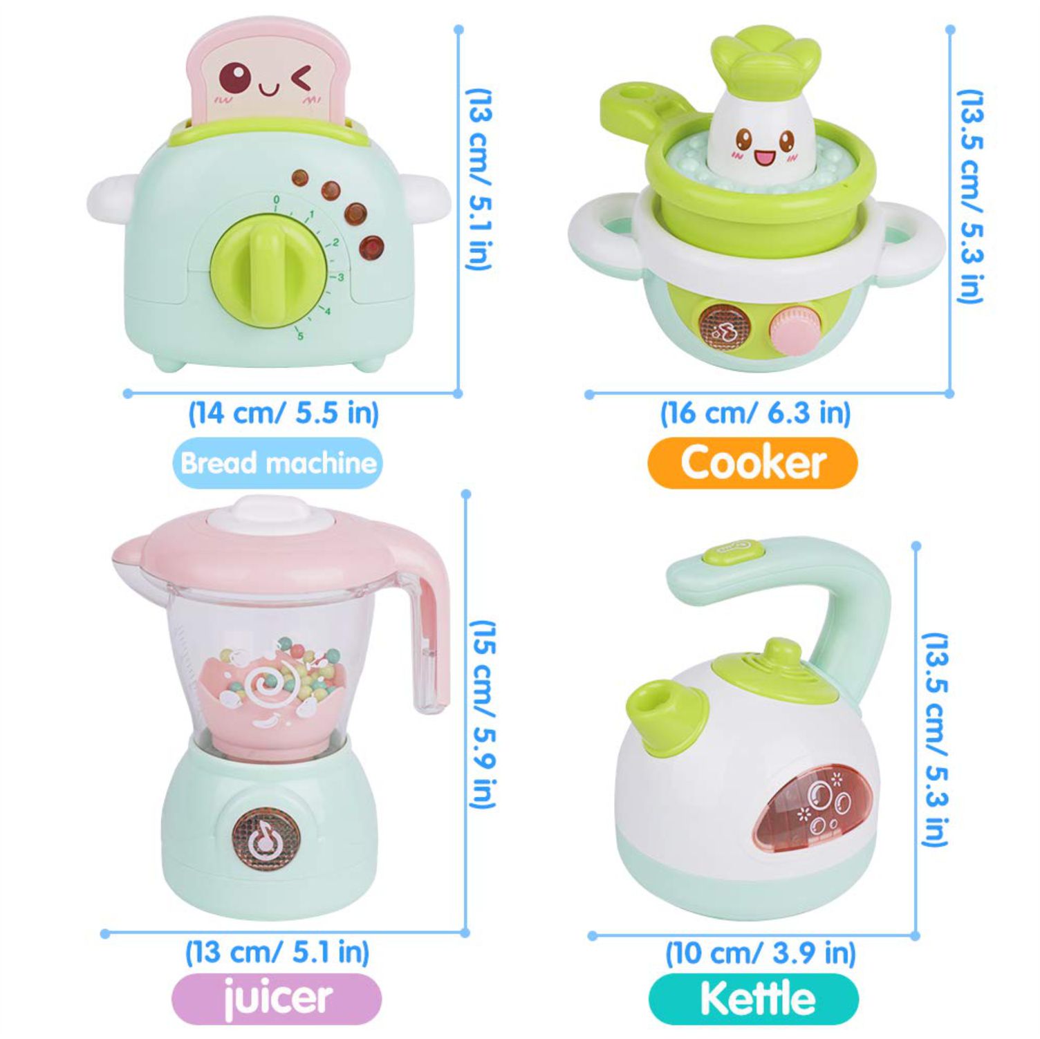 Safe for kids: the toy set includes 1 toaster, 1 Kettle, 1 cooker,1 juicer.