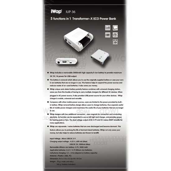 iWap includes a removable 3,000mAh high capacity Li-ion battery to provide maximum DC 5V, 1A power for USB output. The battery can be removed, which allows you to use the originally supplied battery or use your own Li-ion batteries that are no longer in use. This feature helps expand the power sources and reduces waste of unused batteries. It also saves your money.