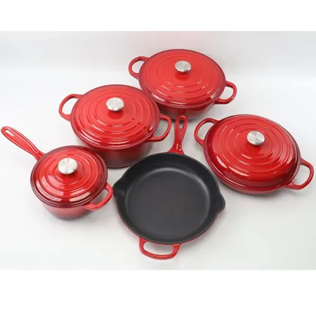 5-pc cast iron cookware set: 20cm, 26cm deep pot, 28cm shallow pot, sauce pot, and 26cm skillet