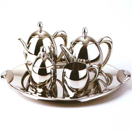 This stainless steel tea set includes 2 tea pots, a sugar server, a milk server and a tray. The handle is sturdily attached to the item for comfortable use. This item is an excellent addition for stylish households.