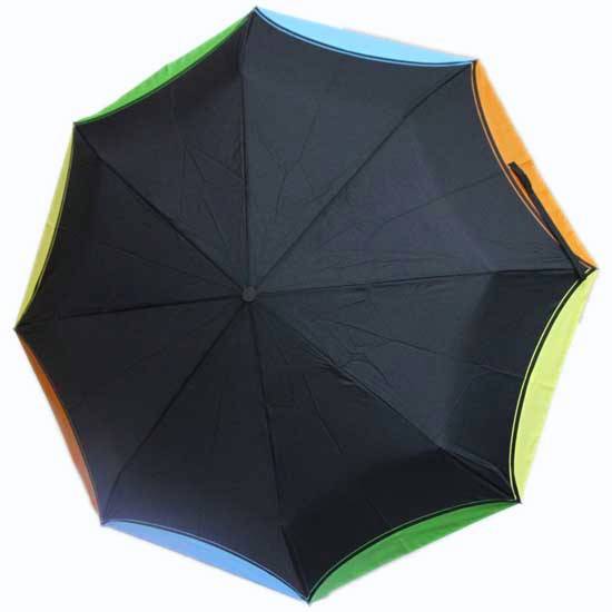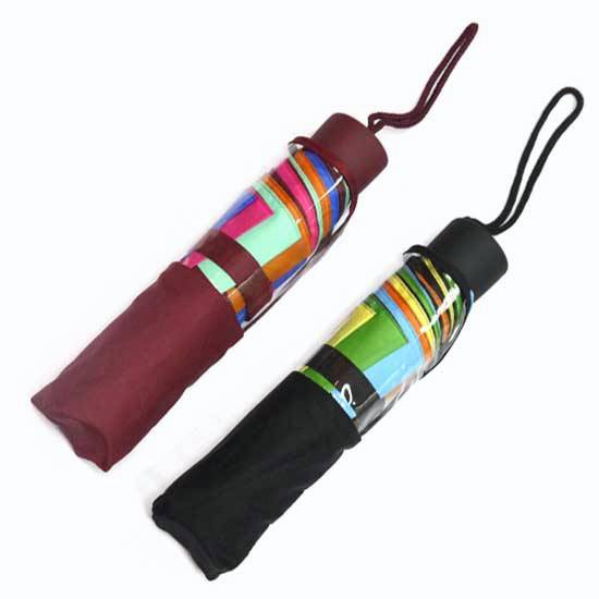 The folding umbrella features a metal frame with fiberglass ribs to withstand strong winds. The umbrella has an ergonomically designed rubber grip for maximum comfort and a secure hold. The multi-color borders makes this umbrella a stylish way to keep you protected from the occasional shower.