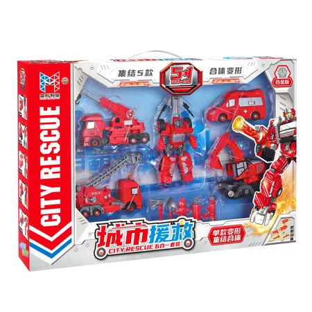 One set includes 5 items. Each small item can be transformed from vehicle to robot. Combine the whole set can build a big robot.