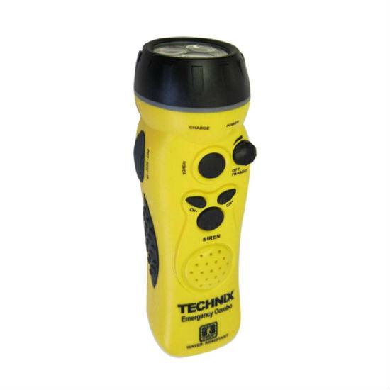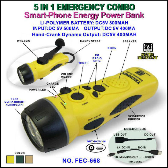 This 5-in-1 emergency combo power bank comes with a robust and water-resistant housing with skid-proof rubber handle for added endurance. The hand-crank dynamo system is easy operate to charging the smart-phone. this power bank also offers functions including a torch, flash light, siren, FM radio