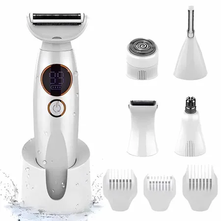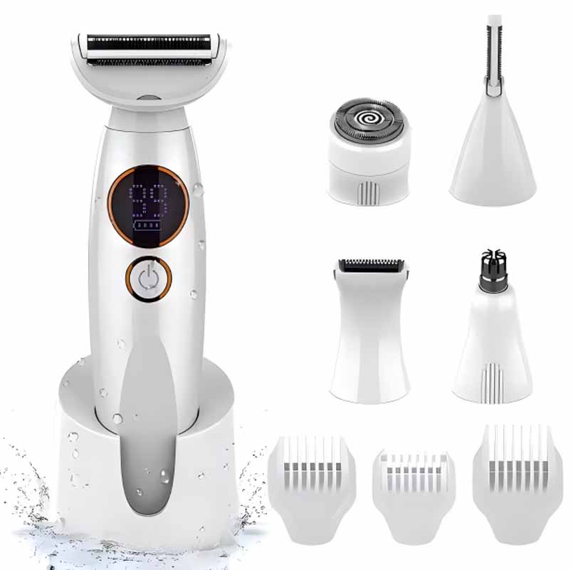 Includes: Main unit, dual blades with a net, short-hair trimmer, long-hair trimmer, nose trimmer, eyebrow trimmer, cleaning brush, charging cable