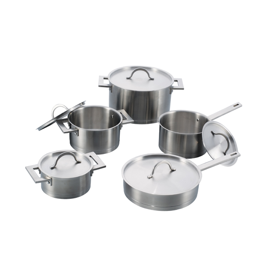 The stainless steel cookware set features three various sizes of stock pots and two sauce pans. The square handles are sturdily riveted at the sides of the stockpots for easy transportation. A shining trimming distinctly highlights the bottom of each silvery pot.