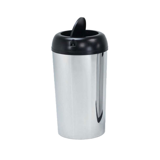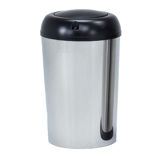 The trash bin features a stainless steel body and base with a black plastic lid. The electric sensor self-opening operation allows for great convenience. The trash bin is greatly suitable for household or office use.