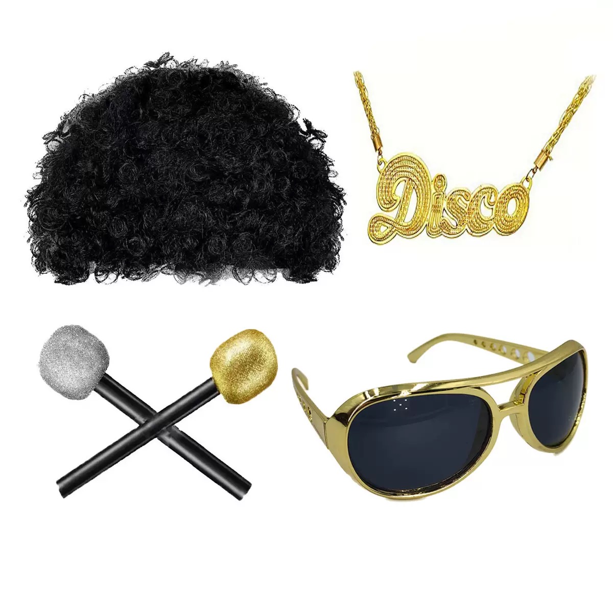 5060年代的迪斯科镀金项链假发麦克风猫王眼镜套装角色扮演