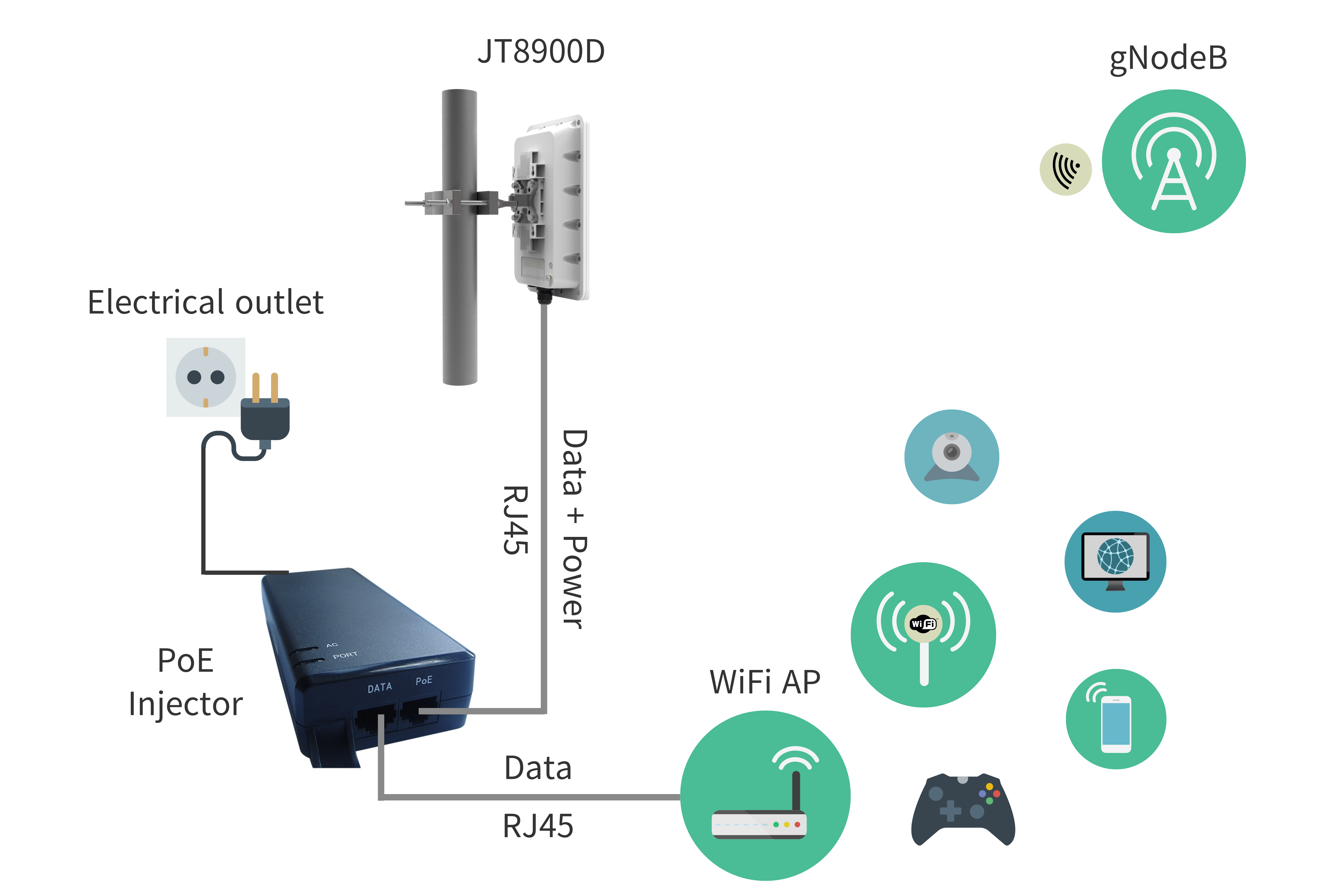 JT8900D provides Gigabit PoE connection to connect user terminal device such as indoor router or Wi-Fi AP products. The unit PoE interface can also work with standard PoE switches or router products. The product comes with PoE power adapter and mounting bracket accessories for quick self-installation.