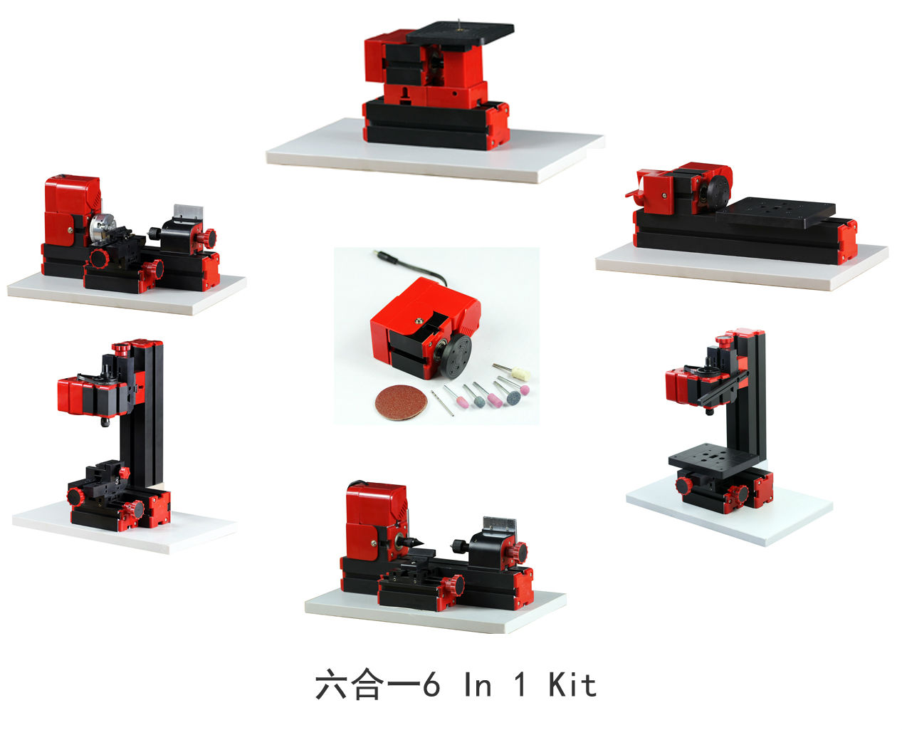 The parts in the kit can be assembled into 6 kinds of machines with different function- jigsaw, wood turning lathe, metal lathe, milling machine, drilling machine, sanding machine, only one kind of machine can be assembled each time. 1. Motor speed: 20,000rpm/min (optional choice 12,000rpm/min) 2. Input voltage/current/power: 12VDC/2A/24W Switching power input: AC110V-240V 3. Jigsaw working table size: 90mm*90mm 4. Maximum working material diameter of metal lathe and woodturning lathe: 50mm 5. Working material length of metal lathe and woodturning lathe: 135mm 6. Axis X travel: 30 7. Collets: 1-6mm 8 .Drilling working table size: 123*100mm 9. Maximum workpiece size clamped by machine vice: 30mm 10. Maximum workpiece diameter clamped by three-jaw chuck: 50mm 11. All of the machines are safe touch except milling machines. It requests to be used under parents or teachers instruction when the milling machine is being used by the kids. Thickness of working material of jigsaw: hardwood 4mm, plywood 7mm, soft wood 18mm, aluminum 0.5mm, acrylic 2mm. It is a good tool for families and schools to do model airplane and other wood model crafts.