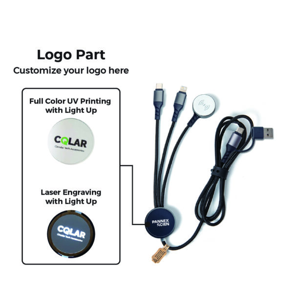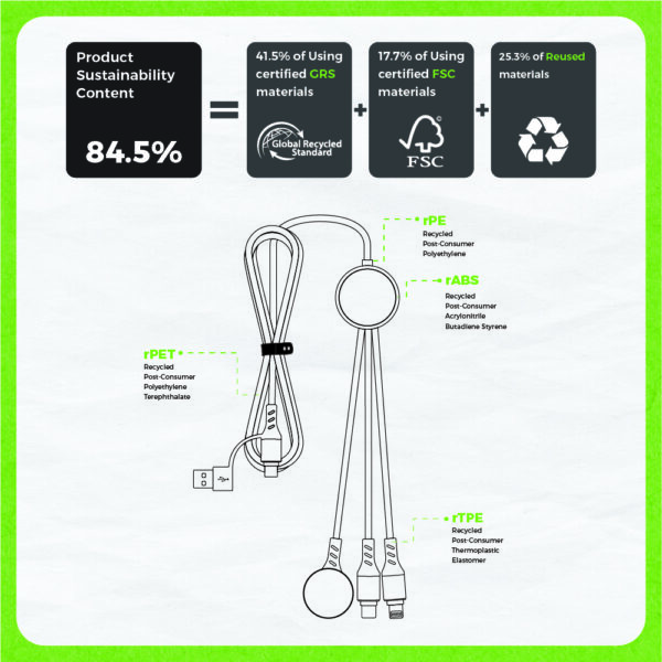 The sleek aluminum logo plate not only enhances durability but also serves as a stylish branding area, making this a standout choice for eco-conscious corporate gifts. The cable is made from 84.5% certified post-consumer recycled TPE/PET, and it’s packed in biodegradable FSC® kraft paper with a recycled polyester storage pouch.