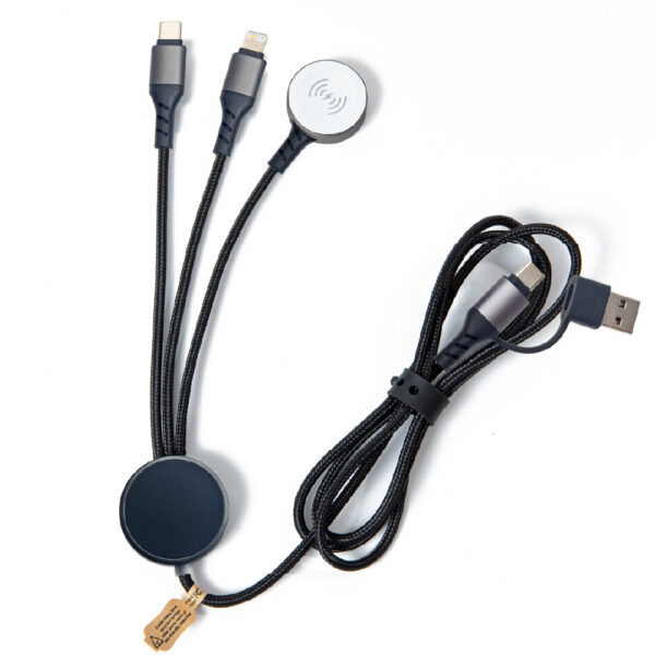 ”We have upgraded the injection molding process, making the protective casing longer than before for better protection of the plug.” Power up responsibly with the TW7122PD-F03 6-in-1 Aluminum Watch Wireless Charging Cable. This versatile cable supports USB-C and Lightning charging, and includes a dedicated magnetic wireless charger for smartwatches (e.g. Apple Watch). With dual input options—USB-A and USB-C—it offers flexibility to connect with a wide range of power sources, from laptops to wall chargers.