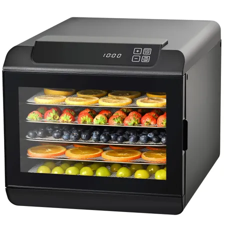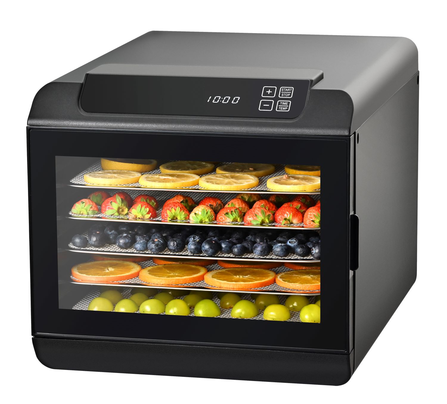 1) 6 stainless steel trays2) Built-in convection fan3) Horizontal air flow4) LED screen display5) Digital temperature control 35-70°C6) Digital timer