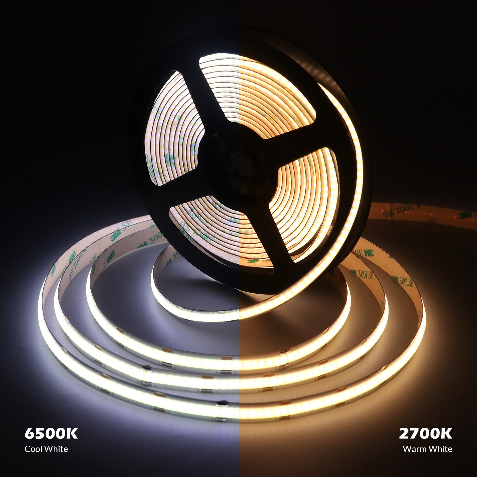 CCT COB LED Strip, 608leds/m, 22W/m, DC12/DC24V, 90RA, 5years warranty, IP20/IP65/IP67/IP68