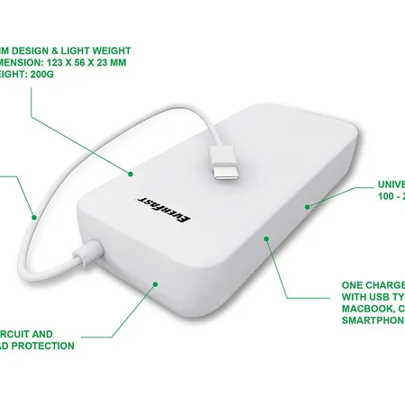 Supports 5V / 9V / 12V / 15V / 20V Type-C devices (with Auto detection) which is compatible to recharge your devices such as Macbook, Google Chromebook, smartphones, tablets and future products with USB Type-C input plug