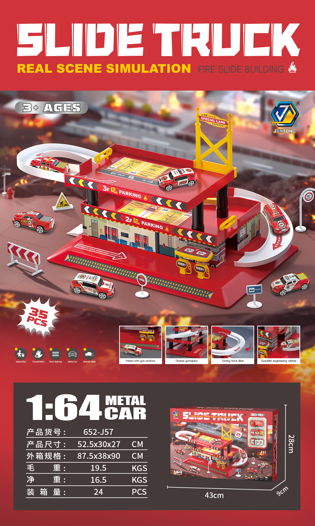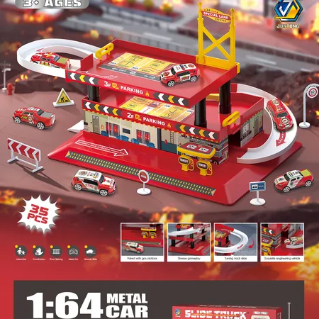 35PCS Fire Theme 3-Layer Track Parking Lot with 3 Iron Sliding Cars