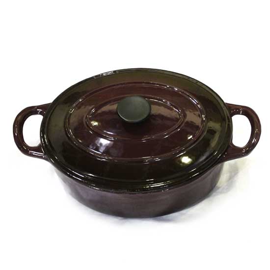 The oval roaster is finely made of heavy-duty cast iron. The ergonomic handles are designed for easy and comfortable grip. The bright color adds a decorative look to the appearance.