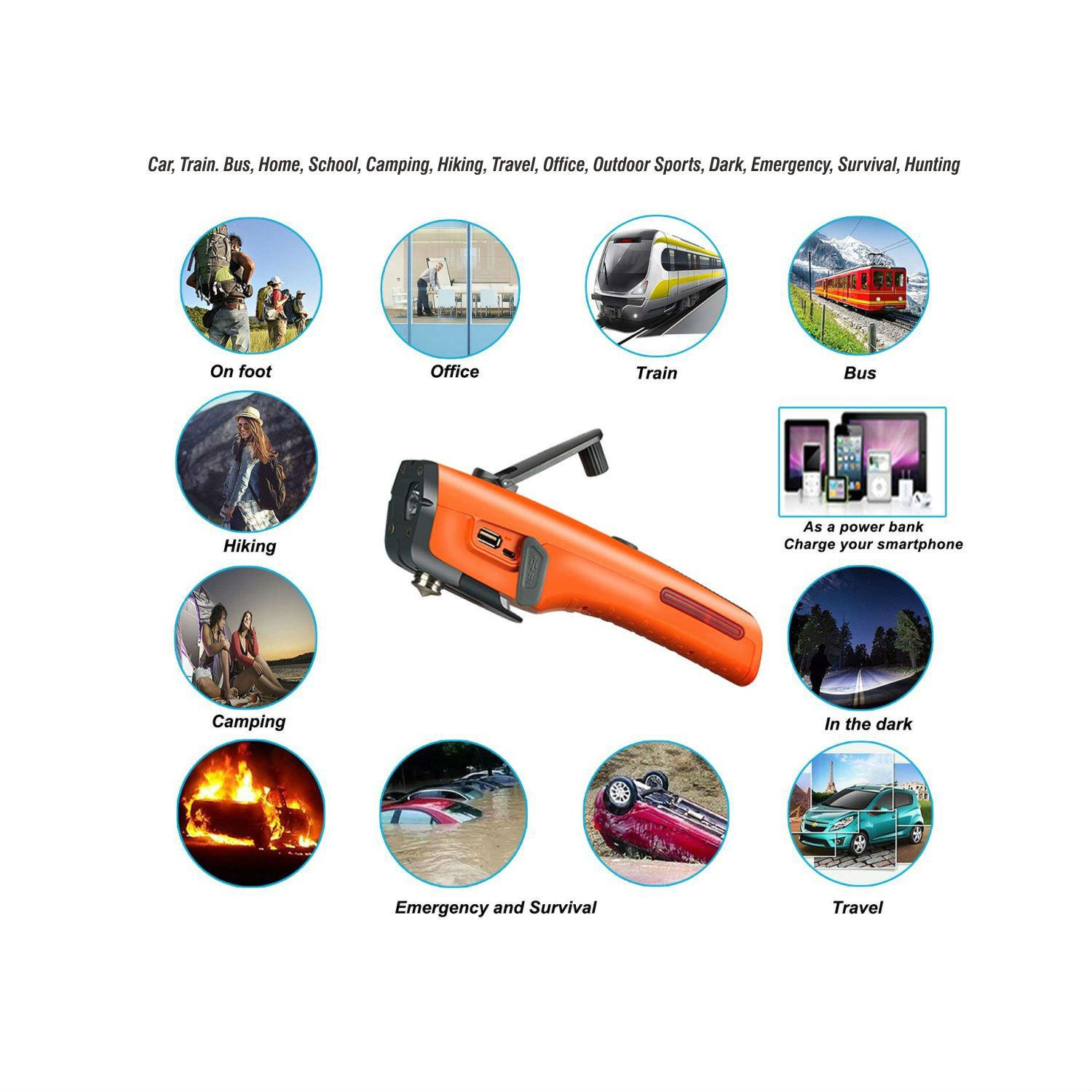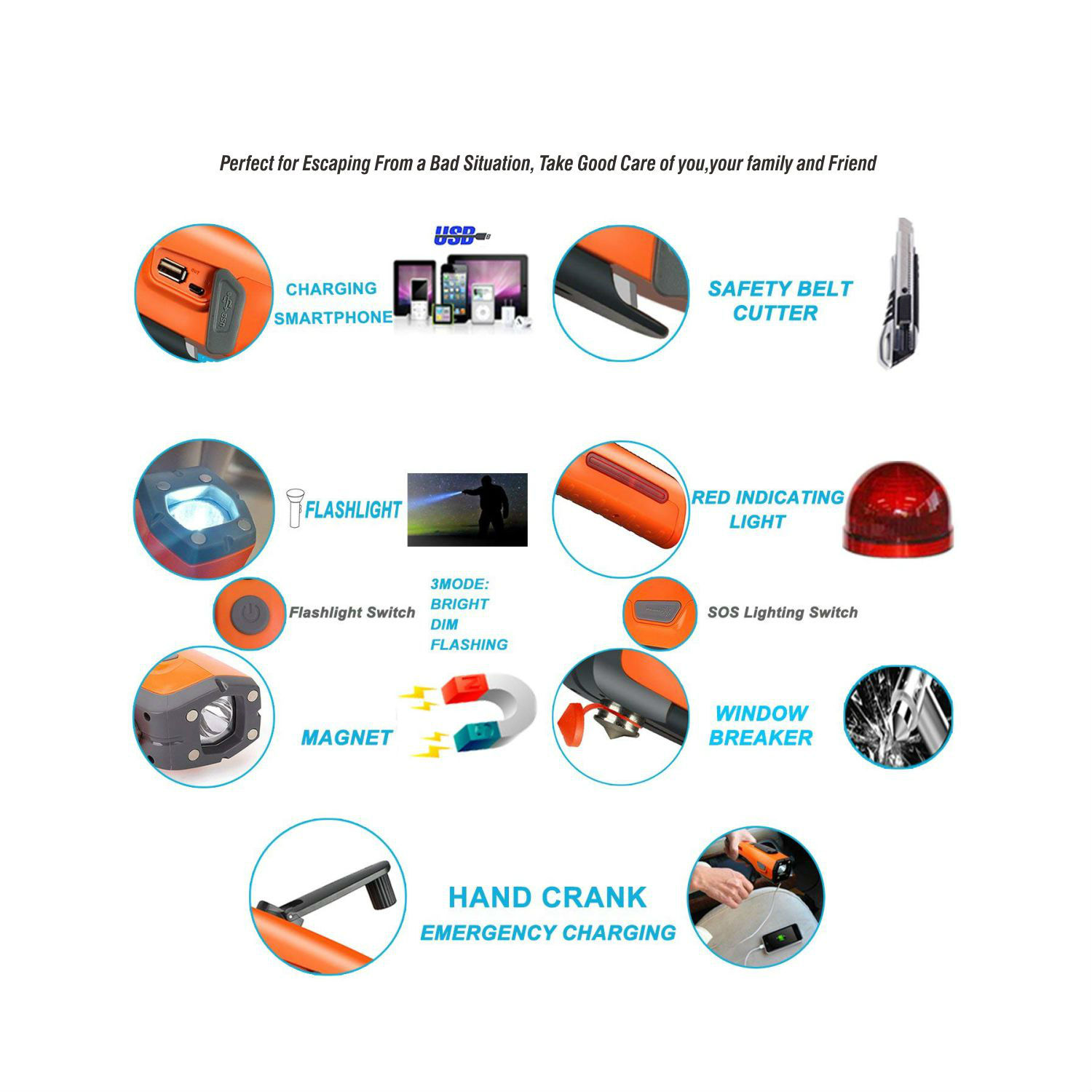 7-in-1 EMERGENCY KIT: Window Breaker, Seat Belt Cutter, Red indicating light (SOS lighting), Magnet, LED Flashlight (Bright / dim / flashing), USB charger with Cables, Hand Cranking Charging System.