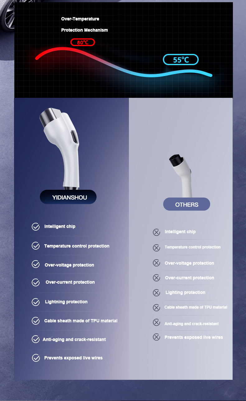 Ground Protection,Leakage Protection, Over Current Protection,Over/Under Voltage Protection,Short Circuit Protection,CP Abnormal Protection,Temperature Protection,Electrostatic Protection,Surge Protection