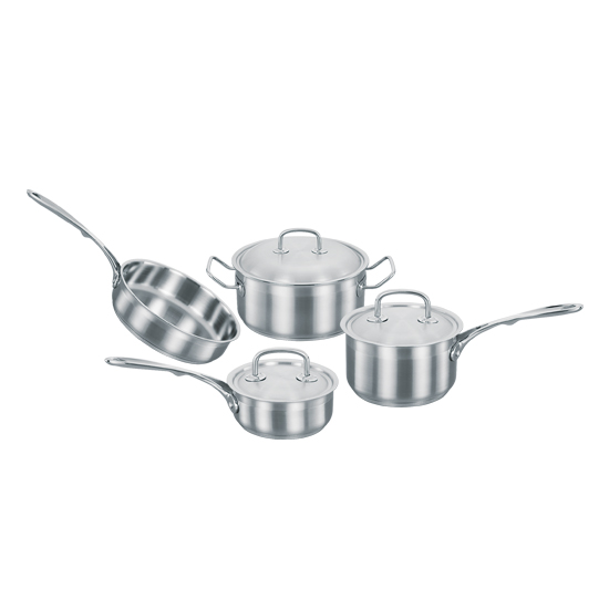 7pcs stainless steel cookware set, 304 material, 0.8mm body thickness, 4mm aluminum impact-bonding bottom, induction base, satin finish inside and outside, die-casting handle, 304 ss lid