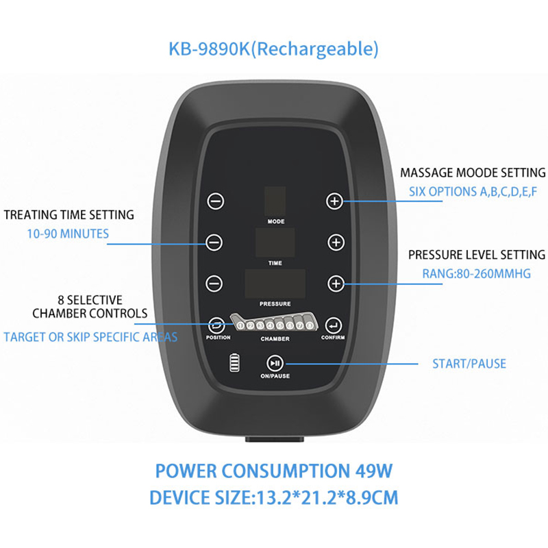 Pressure therapy is a high class lymphatic drainage and Spa natural health beauty machine in medical and beauty market. In beauty market, the compression system has a soft massage from feet to heart, and it is slimming treatment by drainage dissolved fat cells or bad deposit. In medical market, it has a sequential squeezing from distal to proximal, thus help to improve the circulation of blood and lymph, and to prevent the DVT and PE, trauma, inflammation and edema relief .