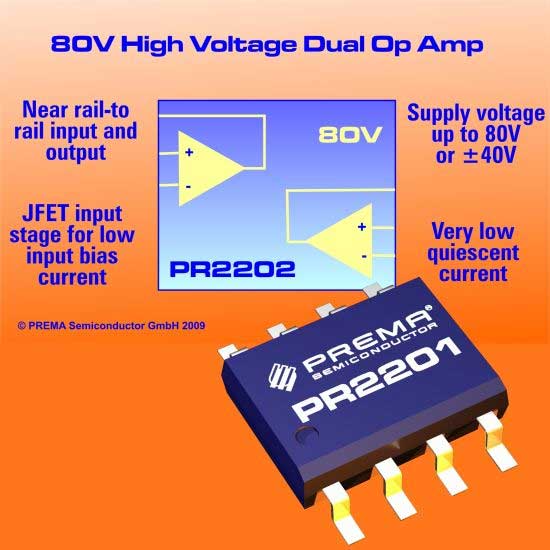 This high-voltage operational amplifier works for supply voltages of up to 80V single supply or up to ±40V and a maximum output current of ±6mA. The common mode input voltage covers nearly the complete supply voltage range with an excellent common mode and power supply rejection ratio of typical more than 110dB. The output voltage can approximate the positive or negative supply voltage close to 1V.