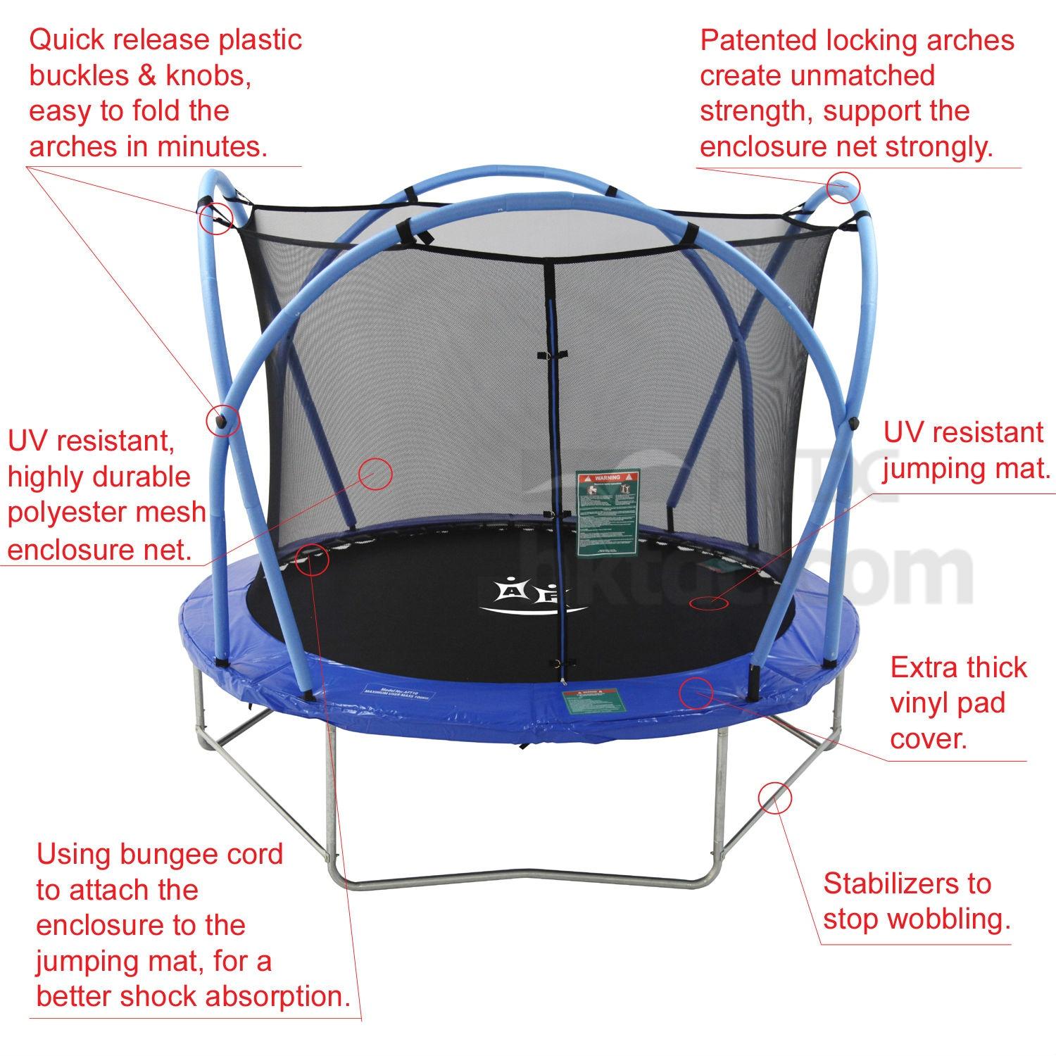 The ingenious design arches form an integrated framework, create unmatched structural strength to support the enclosure net, differentiate our trampolines from traditional trampolines.