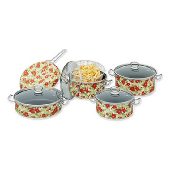 The 9-piece cookware set flaunts a well-executed design with allover floral patterns in red. Each cookware showcases porcelain enamel on the outside and is finished with a 3-layer non-stick coating on the inside. The meticulously crafted construction ensures each cookware promote even heat distribution for efficient cooking. This 9-piece cookware set is a must-have for every kitchen.