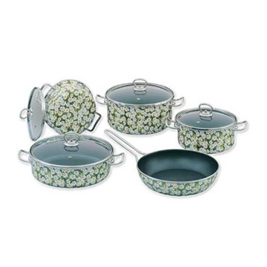 The beautiful cookware set is completed by 9 pieces of cooking pots, saucepans, frying pans, etc. Each cookware boasts a porcelain enamel exterior with elegant floral patterns, and a 3-layer non-stick coating on the inside for easy cleaning. Show off your amazing cooking skills with this 9-piece cookware set.