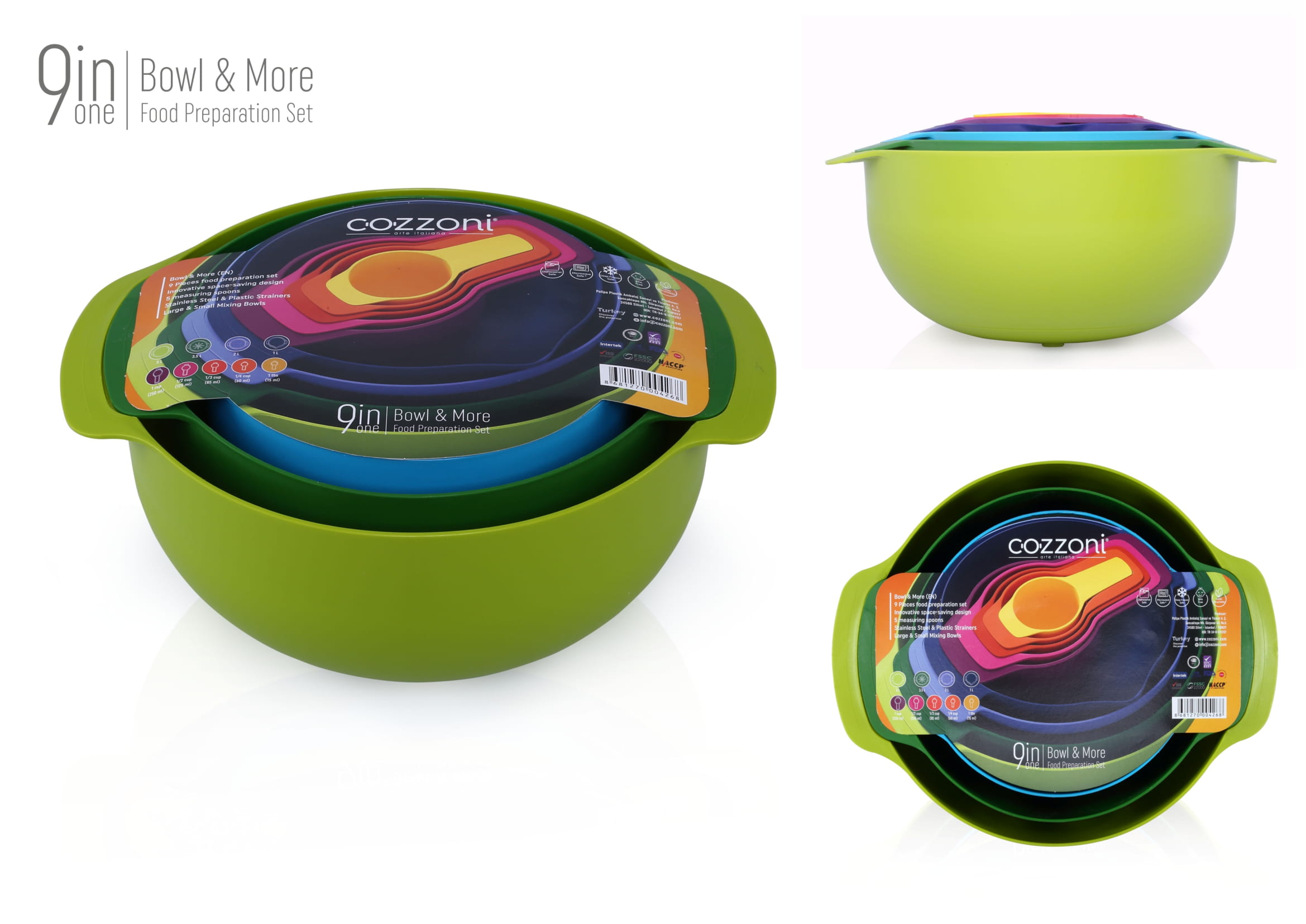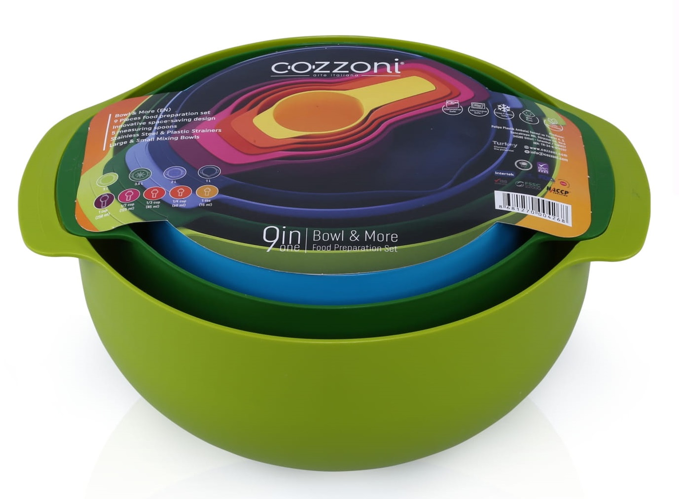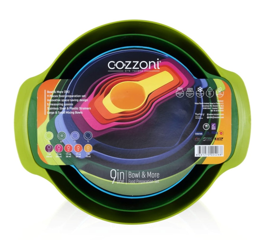 1 x (15 ml - 60 ml - 85 ml -125 ml-250 ml Measuring Spoon - 1 L Measuring Mixing Bowl - 2 L Stainless Steel-Plastic Strainer – 3.5 L Strainer - 5 L Mixing Bowl)