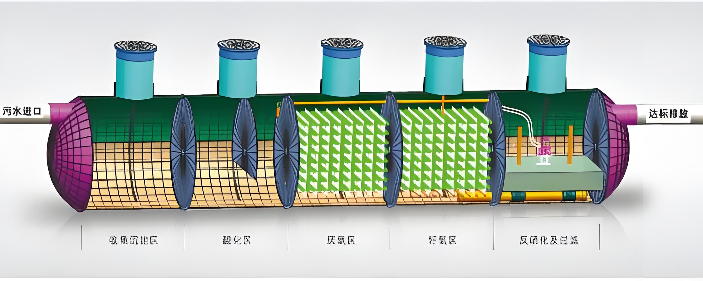 After being collected by the drainage system, the sewage enters the grid well of the sewage treatment plant. After removing particles and debris, it enters the regulating tank for homogenization and equalization. A liquid level controller is installed in the regulating tank, and then the signal is transmitted by the liquid level controller. It is pumped by the lifting pump to the A-level biological contact oxidation tank for acidification, hydrolysis, nitrification and denitrification, reducing the concentration of organic matter, removing some ammonia nitrogen, and then flows into the O-level biological contact oxidation tank for aerobic biochemical reaction, The vast majority of organic pollutants in the O-level biological tank are degraded through biological oxidation and adsorption, and the effluent flows to the secondary sedimentation tank for solid-liquid separation.