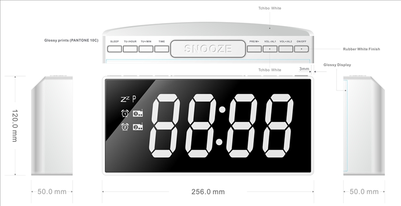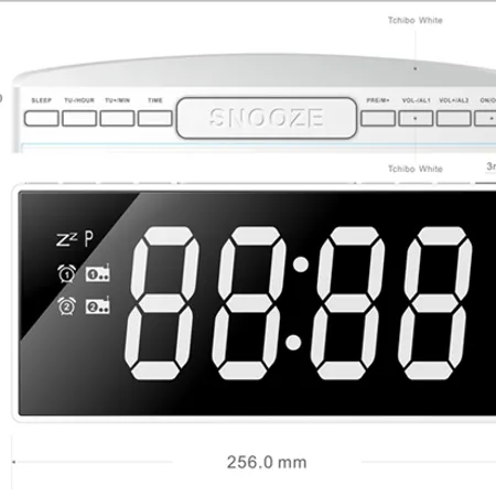 3" white LED display 4 stage display dimmer (display max=100, medium=50, very low, Off) FM PLL radio, 10 preset stations. The"very low"brightness must be agreed with Tchibo Dual alarm clock Digital clock, 24h AUX in jack 9 stage sleep timer (10 mins, 20 mins, 30 mins 90 minutes) Snooze, 9 minutes (if display is off, snooze activates light) Wake up by radio or buzzer (crescendo) Matchig coloue power cable length (160cm) Time backup (incl. button cell CR 2032) Transparent silicaon feet including 1A charging slot for mobile charging UNIT size (L/W/H mm) 256 120 50