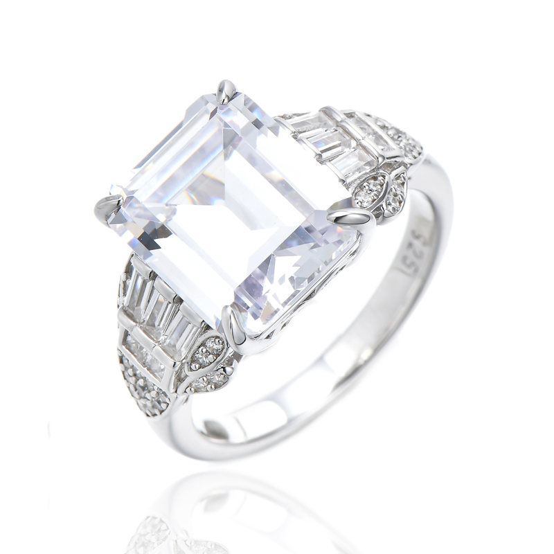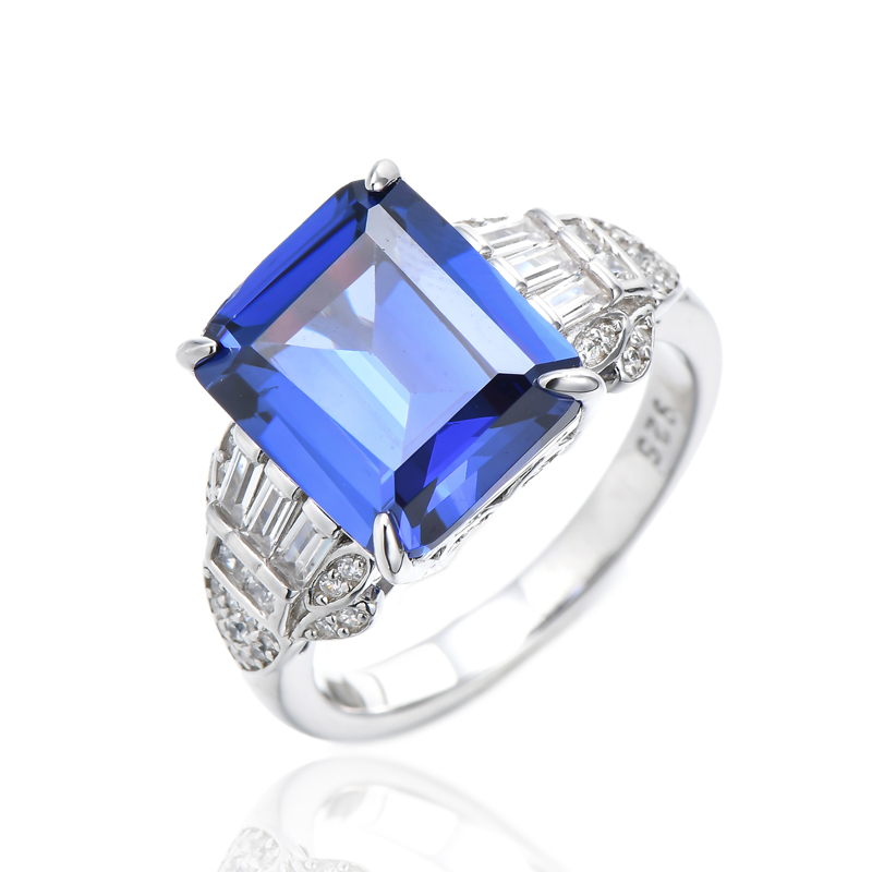 925 Emerald Cut Tanzanite And White Cubic Zircon Rhodium Silver Ring