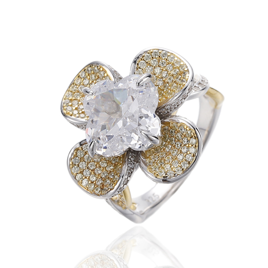 925 Flower Shape White And Round Golden Cubic Zircon Silver Ring With Rhodium And Gold Plating