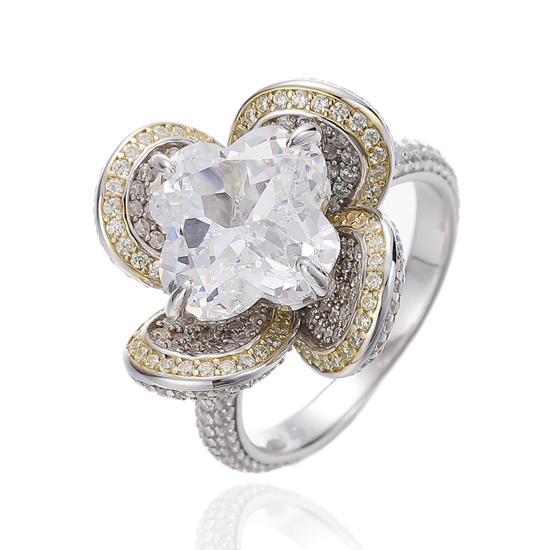 925 Flower Shape White And Round Golden Cubic Zircon Silver Ring With Rhodium And Gold Plating