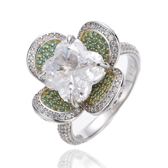 925 Flower Shape White And Round Golden Cubic Zircon Silver Ring With Rhodium And Gold Plating