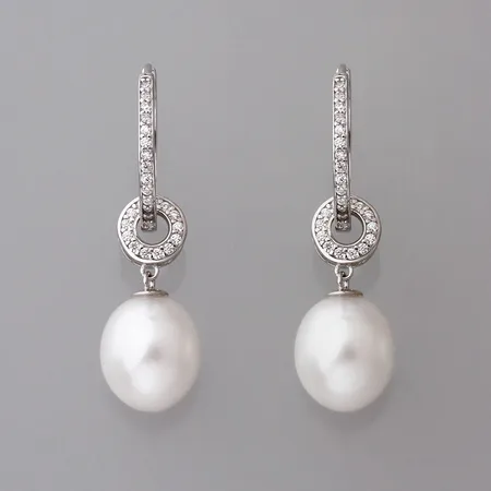 STERLING SILVER EARRINGS WITH 9-9.5MM DROP SHAPE FRESHWATER PEARL AND CZ, RHODIUM PLATED, CAN WEAR TWO WAYS, AND THE DROP PART CAN USE AS A PENDANT