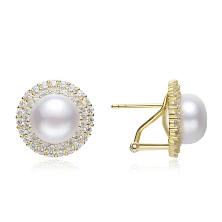 STERLING SILVER EARRINGS WITH 10.5-11MM WHITE BUTTON FRESHWATER PEARL AND WHITE CZ, FLASH YELLOW GOLD COLOR PLATED.