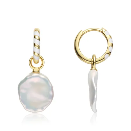 STERLING SILVER EARRINGS WITH ENAMEL AND 12-13MM KESHI FRESHWATER PEARL (PEARL PART CAN TAKE OFF), YELLOW GOLD PLATED