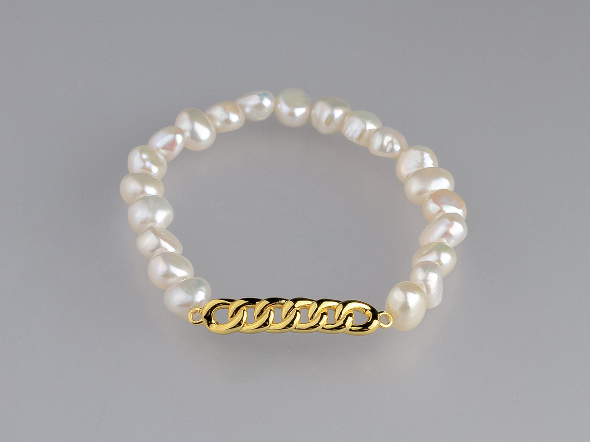 STERLING SILVER BRACELET WITH 7-7.5MM IRREGULAR FRESHWATER PEARL, YELLOW GOLD PLATED