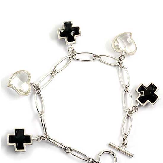 This 925 silver bracelet comes with a linked chain in a highly glossy finish. It is beautifully accented with attractive sweetheart and cross charms. This fashionable jewelry piece is secured with a toggle-styled clasp.