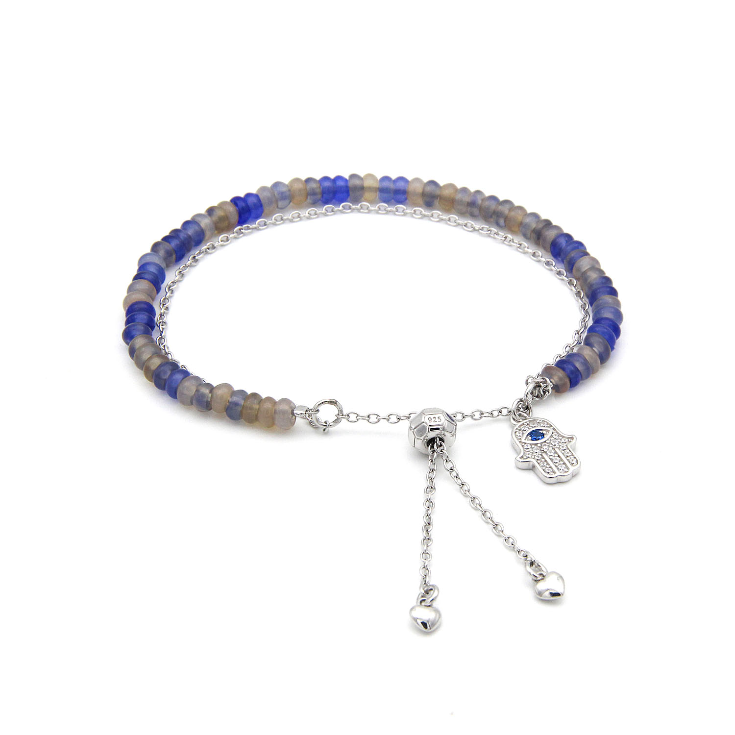 925 silver bracelet in rhodium plating set with clear CZ, simulated blue spinel and blue & grey agate