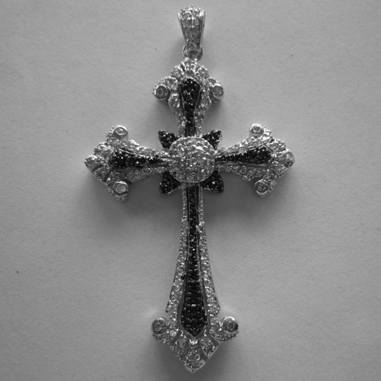 This 925 silver cross pendant features an art deco design with exquisite detail. Black and white sparkling stones are added to this piece of jewelry for an extra touch of elegance. This gorgeous pendant complements your evening dress beautifully.