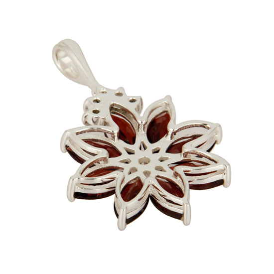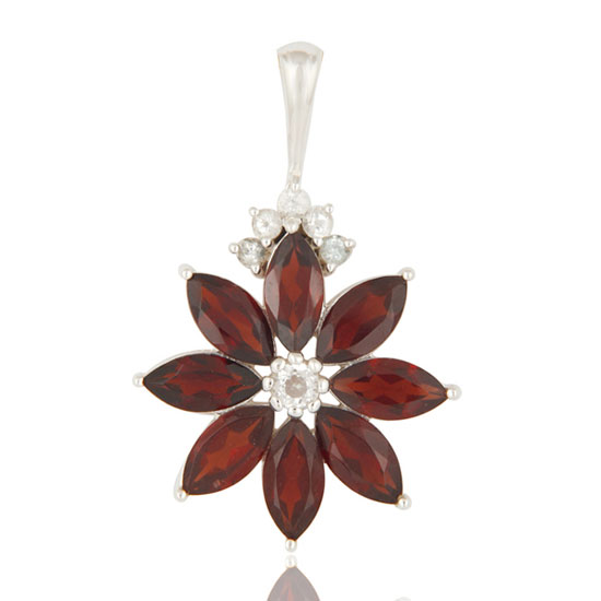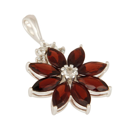 This natural garnet and topaz pendant comes in a 925 sterling silver setting. The floral pattern adds a touch of femininity to the whole piece. It is nice to pair with a beaded chain for an on-trend look.