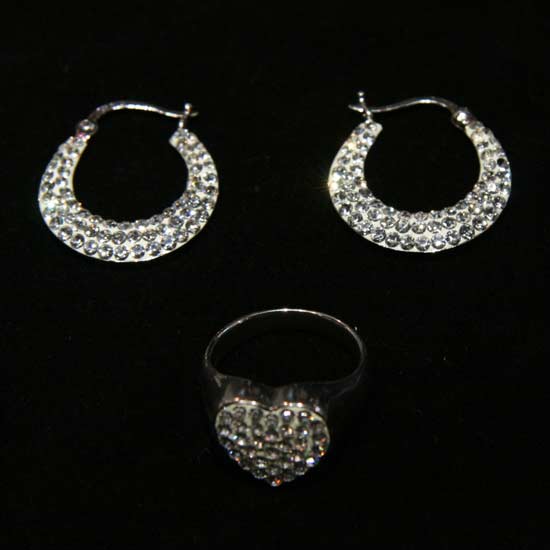 The stunning rhodium-plated 925 silver jewelry set includes a pair of earrings and a ring with a flat body. The pair of dangle earrings features a remarkable charm in the shape of a crescent while the ring comes with a heart-shaped charm. Both are embedded with Swarovski crystal which glitters in alluring brilliance.
