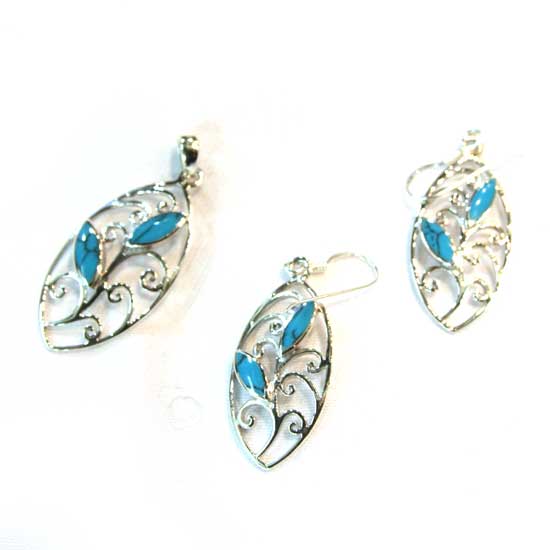 This ladies' jewelry set is completed by a pendant and a pair of earrings. Crafted with 925 sterling silver, this nature-inspired set of jewelry is adorned by blue, synthetic turquoise pieces for a special touch. This 925 silver jewelry set is the one for a special occasion.